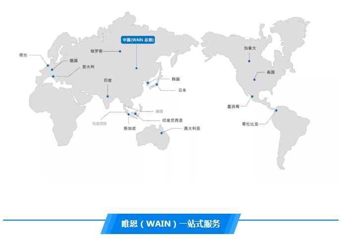 在海外,唯恩(WAIN)擁有德國分公司,新加坡分公司,日本、韓國戰略合作伙伴,以及在歐洲、美洲、東南亞等均有設代理商或經銷商,從建立,到磨合,到逐步產生默契的配合模式,唯恩(WAIN)期望為海外客戶提供更為標準化的服務。